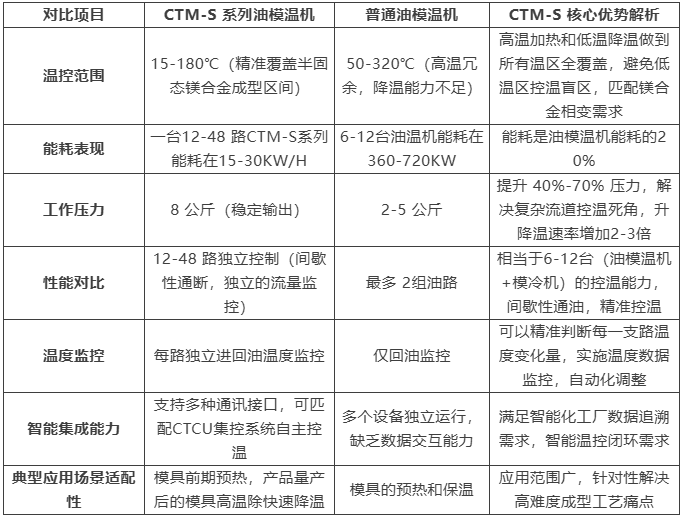 半固態專用溫控CTM-S系列油模溫機 為此,新昱科技全新推出半固態專用溫控新裝備CTM-S系列油模溫機,對比傳統油模溫機有如下特點: