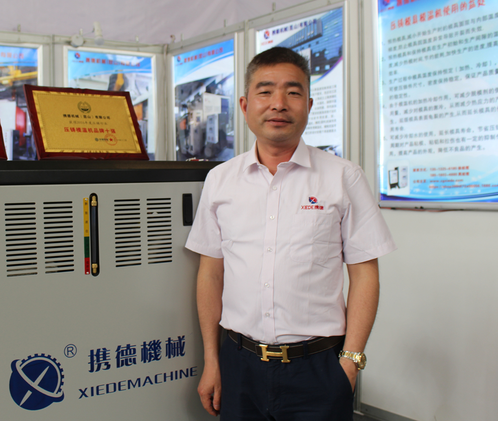 昆山攜德總經理周鋒先生 攜德機械(昆山)有限公司展出一臺技術升級的壓鑄專用模溫機。順應“工業4.0”發展趨勢和配合壓鑄生產自動化,攜德壓鑄模溫機導入溫控管理系統,實現智能物聯,與壓鑄主機信號對接,智能終端遠程操控,助推企業用戶自動化、智能化、數字化管理。 昆山攜德總經理周鋒先生表示,新型壓鑄模溫機新增多項功能,人機控制界面,方便讀取數據,實施過程控制,故障分析及可追溯。其數據可實現回放,并可與壓鑄機或整套壓鑄島輕松對接,并能通過以太網實現聯網,操作者可在移動端監測設備運行情況。