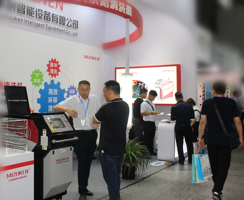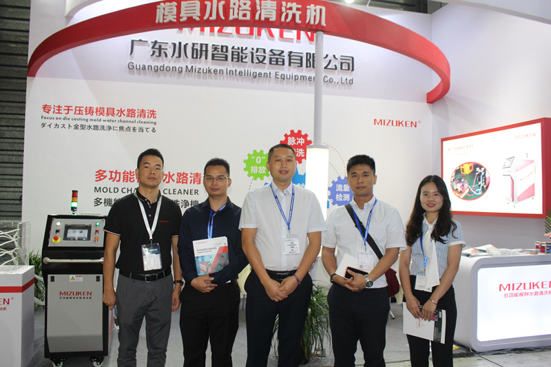 水研參展團隊(中間為許澤路先生) 在2019中國壓鑄展上,廣東水研智能設備有限公司展示多功能模具水路清洗機,展示我司超強脈沖爆破(純物理方式)清洗模具水路。同時帶來一款新型清洗劑,廣東水研獨自研發(fā)的中性除銹劑(已申請發(fā)明專利),除銹效果好,速度快,完全不腐蝕模具,對人體和環(huán)境無害,對多年未清洗的模具水路除銹有意想不到的效果。