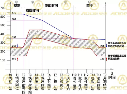 使用模溫機,點冷機的具體優點如下: 【1】預熱模具,減小開始生產時的模具面層與內部溫度梯度,防止模具因溫度異常導致開裂而失效。 【2】預熱模具和保持模具在生產初始和生產間隙的溫度,減少熱模時間,節約能耗,加快生產的進度,提高效率。 【3】生產過程中模具溫度保持恒定(加熱、冷卻),可使壓鑄件尺寸,密度保持穩定,保證產品質量的穩定性。 【4】由于模溫機的加熱冷卻作用,可減少脫模劑的使用量,減少對模具的激冷,從而減少熱應力的產生,延緩模具表面龜裂的產生,從而延長模具的使用壽命。 【5】可以減少冷卻水的使用,延長模具壽命,節省壓鑄周期,對產品粘模、粘鋁和拉傷也有一定的抑制作用,提高產品的外觀,降低不良品的產生。 【6】有效冷卻,控制凝固時間,解決產品縮孔。 【7】合理的控制整個壓鑄周期的模具溫度,幫助實現微噴。 壓鑄件凝固/模具冷卻時間示意圖