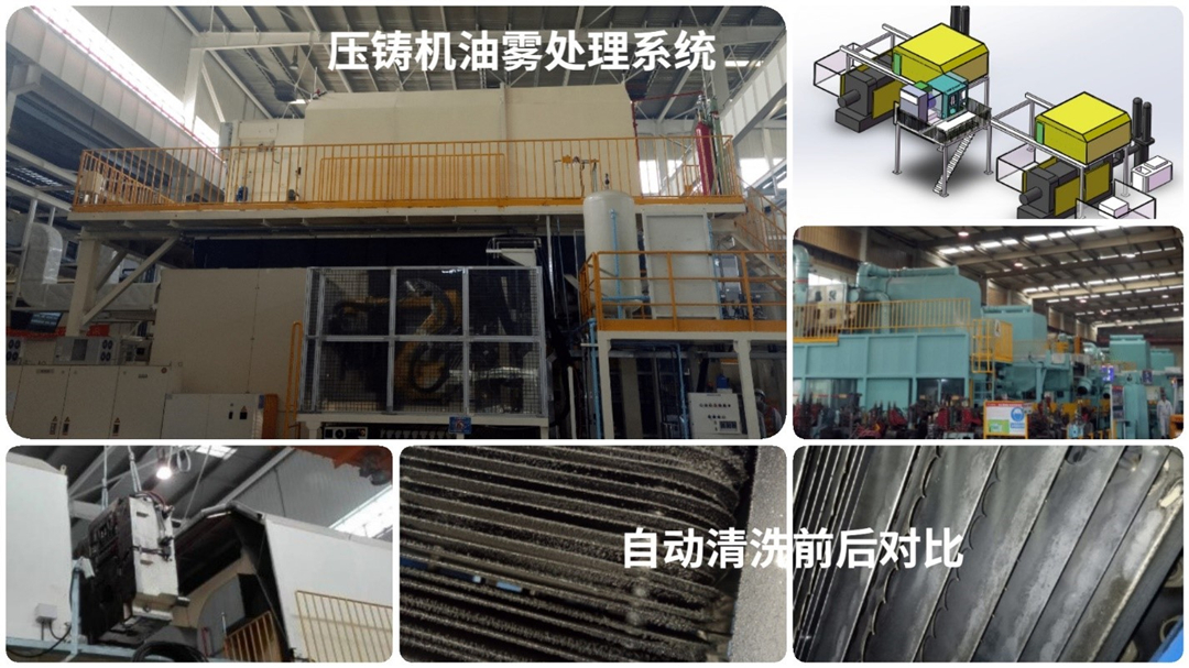 熔爐除塵及在線監測系統 壓鑄領域煙霧凈化設備全面升級 壓鑄領域排出污染物統稱“壓鑄機煙霧”,其來源于脫模劑和沖頭油,脫模劑經過高壓噴射和高溫分解,產生大量的油霧顆粒和有機物,沖頭油經過燃燒產生大量具有一定腐蝕性的黑色煙氣。譚文儉先生說:“之前不少企業的壓鑄機煙氣處于四處冒煙的無組織排放狀態,現在按環保新標準要求,必須進行收集處理。治理壓鑄機煙霧在早十年還不成熟,存在收集不完全(約80%)、凈化效率低(約70%),并且維護成本高,存在防火安全隱患。現在我們產品技術全面升級,主要表現在集煙罩集煙效率高(95%以上),并適合多樣性的滑動技術,高效率(90%以上)無耗材靜電過濾技術,一鍵操作式清洗技術和末端除臭技術,加上適合遠程供貨的標準模塊化集煙罩,一個一個技術加以攻克,產品從500t到3400t全覆蓋,為批量化生產打下基礎”。