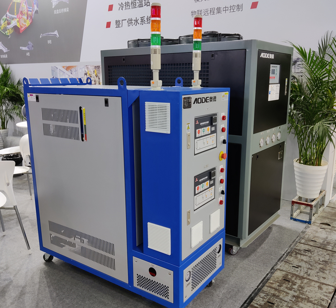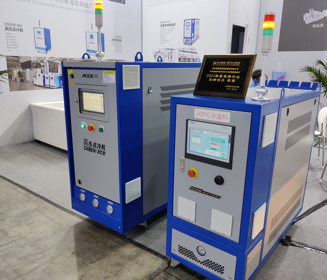 奧德展示的多款溫控設備 高溫水溫機比高溫油溫機的熱傳導效率更高,特別適合用于壓鑄薄壁結構件。設備運轉傳熱媒體為軟水,使用成本極低,不會對車間環境產生污染,屬于綠色環保型設備。同時,由于水的導熱性能好,當模具需要預熱生產時,同比油溫機,水溫機可以更快的將模具溫度升高,節省能耗。