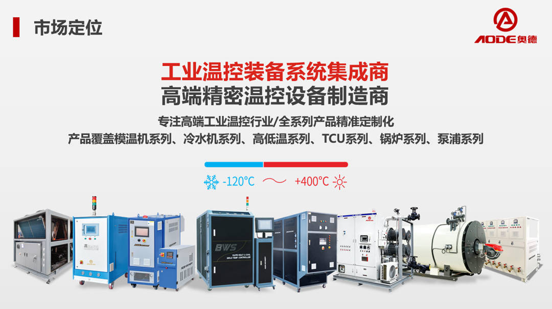 據(jù)介紹,作為“工業(yè)溫控裝備系統(tǒng)集成商”,奧德高端裝備公司為工業(yè)品成型制造提供系統(tǒng)集成的成套溫控解決方案。目前,奧德研發(fā)與制造全系列溫控設備,擁有完整的溫控產品線,產品涵括模溫機、冷水機、TCU溫控單元、高低溫冷熱一體機、點冷機、模冷機、蒸汽/導熱油鍋爐、高低溫流體輸送泵等,溫度控制范圍從低溫-120℃至高溫400℃,系行業(yè)內工業(yè)溫控產品最全的企業(yè)之一。 “精密冷熱溫控設備制造商”,則是奧德從產品和品質角度自我定位。奧德正在打造強大的“供應鏈中心”,不斷完善技術研發(fā)體系、質量管理體系,引進國際領先管理及經驗并結合奧德企業(yè)實際,與國際先進制造企業(yè)接軌,開發(fā)技術領先、品質優(yōu)良、精密高效、穩(wěn)定可靠的工業(yè)溫控設備。 對企業(yè)和產品,奧德高層對自身提出新的要求和目標,那就是“創(chuàng)新、差異化、對標國際”的發(fā)展道路。全方位創(chuàng)新、全面差異化策略,無論是產品、技術、服務,還是管理模式、營銷策略……,都走一條創(chuàng)新、差異化的路線,并學習國際先進技術及管理經驗,對標國際一流企業(yè)。