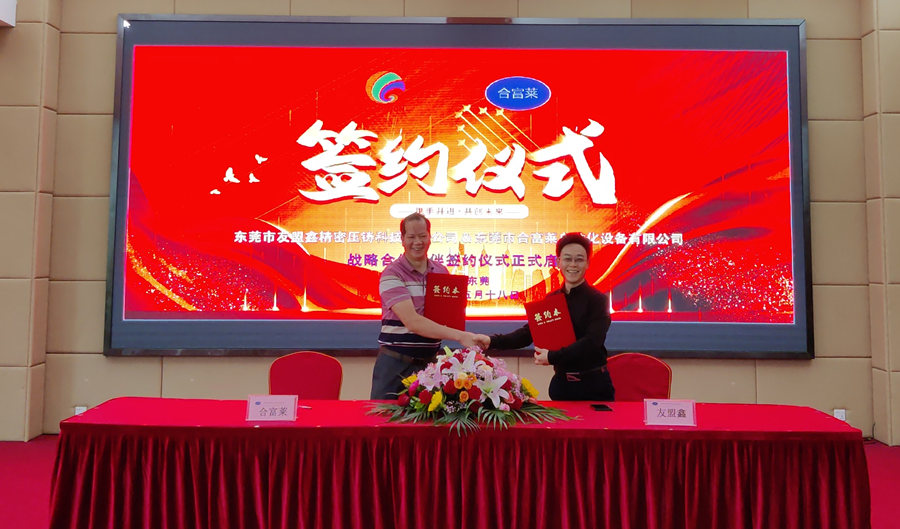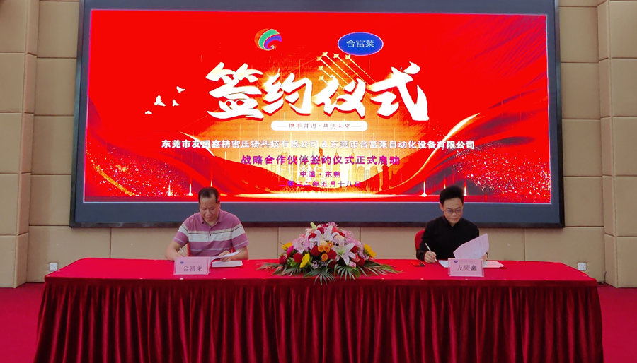 ![]() 雙方企業主要領導與嘉賓合影 《壓鑄周刊》現場報道:2022年5月18日上午,廣東東莞,東莞友盟鑫精密壓鑄科技有限公司(“友盟鑫科技”)與東莞市合富萊自動化設備有限公司(“合富萊自動化”)聯合舉行“批量采購壓鑄自動化設備暨戰略合作簽約儀式”。友盟鑫科技董事長黃忠友先生、合富萊自動化總經理楊炳榮先生分別代表各自企業在采購協議上簽字。