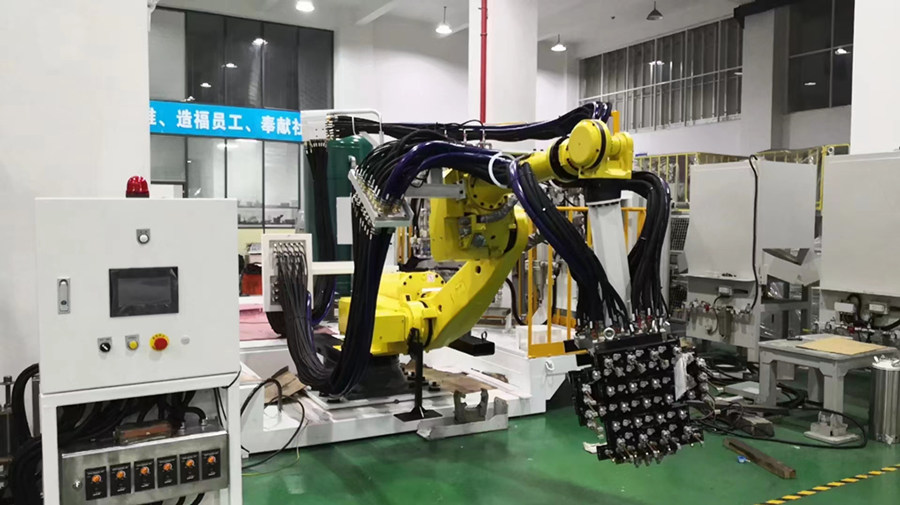 調(diào)試中的取件/噴涂機(jī)器人 胡先生表示:“上海遼遠(yuǎn)致力于打造優(yōu)質(zhì)的產(chǎn)品、解決方案能力以及服務(wù)。我們不斷地提升創(chuàng)新能力,持續(xù)投入資金、人力和物力,開發(fā)新的自動(dòng)化設(shè)備,研發(fā)滿足客戶需求的壓鑄島自動(dòng)化系統(tǒng)方案。在服務(wù)方面,我們持續(xù)提高遠(yuǎn)程服務(wù)和及時(shí)服務(wù)的水平,以及不斷促進(jìn)兩者的高度協(xié)同。
