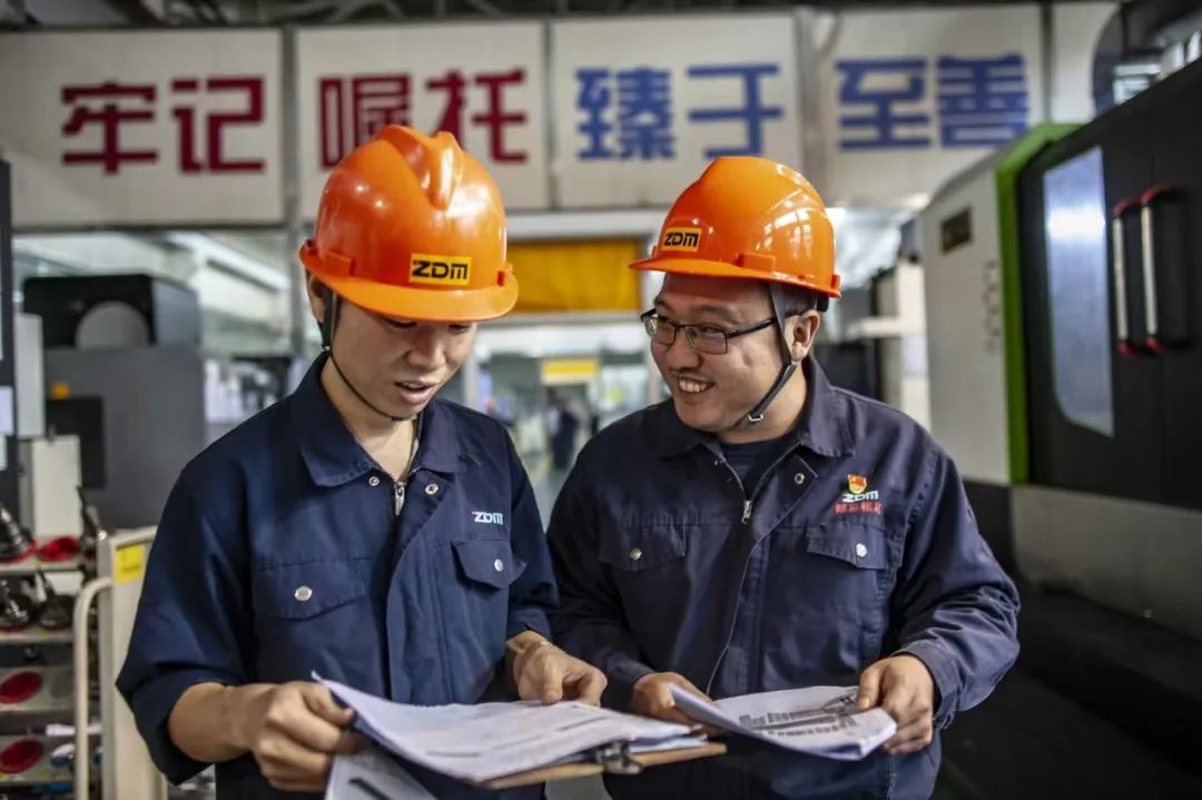 企業生產車間內員工交流經驗 對此,技術團隊經常奮戰在機器旁,積極探索、不斷嘗試,致力于突破某項技術難點,優化某臺生產設備。 “有了這種模具噸位制造的實力,就意味著企業贏得了更大市場。”劉瑾介紹,“但我們追求的終極目標,并不是噸位的升級,而是在能力范圍內把所有的產品做精做好。” 今年11月,臻至還交付了一臺13500噸的適配壓機,模具自重102噸,制作周期128天,生產效率獲得了合作客戶的高度認可。