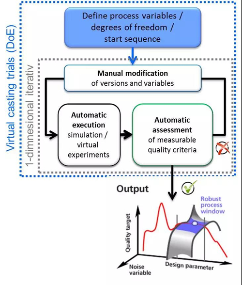 ![]() 圖16:借助于高壓壓鑄中的虛擬工藝窗口分析,進行系統的和有效的穩健性分析的示意圖 穩健的產品和工藝 在結構件中,除資源和成本效率目標之外,有絕對優先級的是嚴格滿足定義的質量要求。為了評估開發的鑄造系統的穩健性和定義的標準工藝參數,虛擬模型通過關鍵工藝參數及其變量得到擴展。工程師定義了目標、要改變的自由度以及評估改進的質量標準。MAGMASOFT®中試驗或工藝窗口的最終虛擬設計分析是自主進行的,不需要用戶的進一步操作,參見圖16。 為了能夠更簡單地評估鑄造質量,通過考慮評估區域來擴展鑄造節點的模擬模型。這些評估區域衡量了特別感興趣區域的計算質量標準。在該示例中,這適用于底部的關鍵功能性厚壁連接點(“評估區域1”)或對于充型過程至關重要的薄壁厚度(“評估區域2”),參見圖17。根據從經驗中獲得的專門知識,計劃目標過程的壓射曲線包括充型結束時的沖頭減速,以避免毛邊,參見圖17中的壓射曲線。