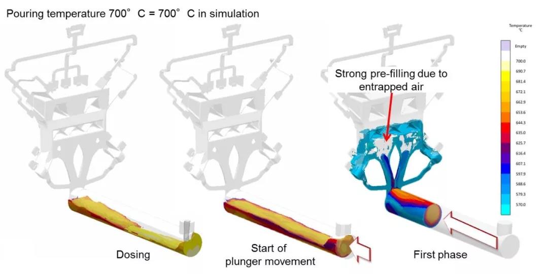 圖4:考慮壓射室的接頭模具充型分析。在沖頭運動的第一階段,所選擇的壓射曲線導致大量的卷氣和金屬液的顯著溫度損失。
