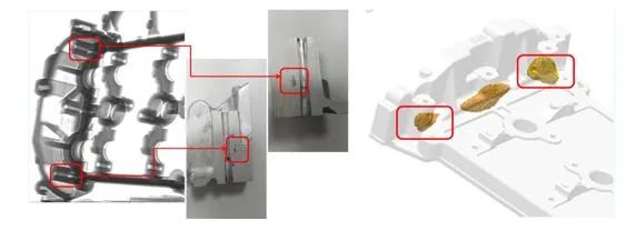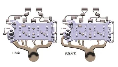 圖2 產(chǎn)品缺陷圖片及模擬熱節(jié)點(diǎn) 2、方案自動(dòng)優(yōu)化模擬分析 針對以上的分析,準(zhǔn)備從2個(gè)方面進(jìn)行改進(jìn)。首先在保證零件成型的前提下,對澆注方案進(jìn)行優(yōu)化。由于縮孔的形成原因是產(chǎn)品壁厚較厚,增加后難以補(bǔ)縮,所以在澆注系統(tǒng)優(yōu)化上先縮小熱節(jié)處的澆口面積,減少流經(jīng)熱節(jié)點(diǎn)處的鋁料,降低模具升溫的幅度。修改后的方案對比圖見圖3所示。其次,澆注系統(tǒng)更改后,與之相匹配的工藝參數(shù)也要隨之變化。在本案例中,以高速速度為變量,以較小的熱節(jié)值為目標(biāo),結(jié)合軟件的優(yōu)化功能讓軟件自動(dòng)運(yùn)算,輸出判定結(jié)果。圖4為設(shè)計(jì)高速速度為變量的設(shè)定圖示。