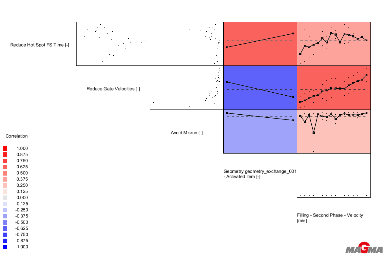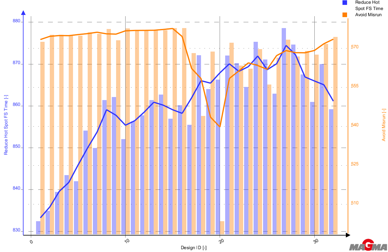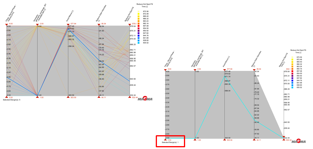 圖4 壓鑄工藝參數(shù)優(yōu)化設(shè)計(jì)圖 圖5為自主優(yōu)化的模擬結(jié)果。圖5a中每一條彩色線段為一組工藝參數(shù)方案,共5個(gè)豎軸,從左至右分為高速變化區(qū)間,壓射方案變化區(qū)間,成型溫度結(jié)果范圍,內(nèi)澆口速度范圍和熱節(jié)時(shí)間范圍。通過拖動(dòng)每個(gè)豎軸上下兩端的箭頭來獲得最佳的工藝方案,例如想要最低熱節(jié)時(shí)間,往下拖動(dòng)豎軸上端箭頭,最后得到最小的熱節(jié)時(shí)間為方案1,同時(shí)方案1的成型溫度也較高,內(nèi)澆口速度相對較低。圖5b左豎軸為熱節(jié)時(shí)間范圍,右豎軸為成型溫度結(jié)果范圍,下橫軸為全部工藝方案,通過觀察溫度和熱節(jié)時(shí)間的變化曲線,可以發(fā)現(xiàn)方案1的成型溫度相對較高,熱節(jié)時(shí)間最短。圖5c最上一排為熱節(jié)時(shí)間根據(jù)不同方案和高速速度的變化規(guī)律,第二排為內(nèi)澆口速度根據(jù)不同方案和高速速度的變化規(guī)律,第三排為成型溫度根據(jù)不同方案和高速速度的變化規(guī)律,右一豎排為高速速度的變化范圍,右二豎排為幾何方案的變化范圍,以熱節(jié)時(shí)間結(jié)果為例,該結(jié)果時(shí)間變長隨著從方案一切換到方案二,同時(shí)其總體趨勢隨著高速速度的提升而變長,所以通過觀察其變化規(guī)律,從而抓出最準(zhǔn)確的方案與工藝參數(shù)。綜合以上所述,在保證成型溫度的基礎(chǔ)上,采用相對較低的壓射速度并配合壓射方案一,可以獲得最小的熱節(jié)時(shí)間,通過減小熱節(jié)時(shí)間,從而降低實(shí)際生產(chǎn)中所出現(xiàn)的凝固收縮類缺陷。