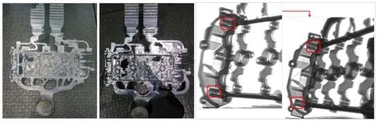 c.總變量與總目標(biāo)變化趨勢圖片 圖5 模擬結(jié)果 3、實(shí)際驗(yàn)證 根據(jù)優(yōu)化后的澆注方案以及工藝參數(shù)進(jìn)行實(shí)際生產(chǎn),對壓鑄出產(chǎn)品做內(nèi)部質(zhì)量檢測,檢測結(jié)果顯示產(chǎn)品壁厚位置縮孔得到改善,如圖6所示。實(shí)踐結(jié)果表明通過采用改善后的壓射方案并配合最佳工藝參數(shù),解決了實(shí)際中產(chǎn)品出現(xiàn)的缺陷。