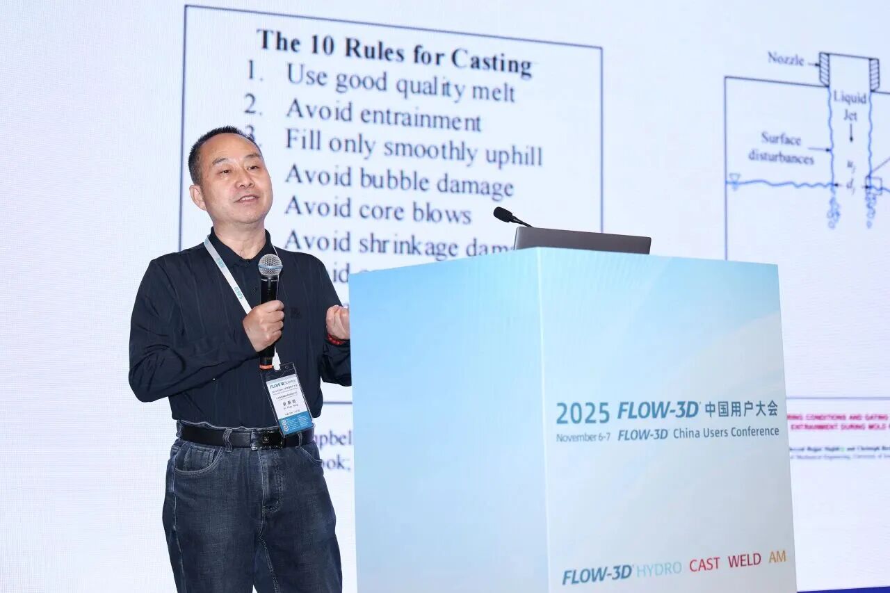 FLOW-3D 中國總經理蘇嘉宏先生 在本屆大會上,多家用戶企業的技術專家深入分享了FLOW-3D CAST在黑色金屬鑄造與有色金屬鑄造領域的前沿技術成果與最新應用案例,充分展現了該軟件在提升鑄造工藝優化水平與質量控制能力方面的強大優勢。與此同時,FLOW-3D 中國技術團隊重點介紹了FLOW-3D CAST的最新版本功能及其在半固態成形模擬中的創新應用,為行業客戶帶來了更高效、精準的解決方案。 大會演講環節亮點紛呈,具體報告如下:
