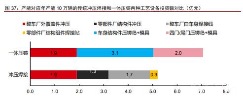 全車結(jié)構(gòu)件年產(chǎn)能 10 萬輛所需壓鑄設(shè)備投資 5.5 億,全球年產(chǎn) 5000 萬輛汽車對應壓 鑄設(shè)備總投資額達 2775 億元。根據(jù)上文壓鑄機規(guī)格、數(shù)量,結(jié)合與壓鑄機行業(yè)專家調(diào)研 設(shè)備市場價格,我們認為按照產(chǎn)能/產(chǎn)量余量 30%計算,對應年產(chǎn)能 10 萬輛車的壓鑄機+ 輔機組成的壓鑄島,車身+車門總投資約 4.3 億,含座椅壓鑄則設(shè)備總投資為 5.5 億。按照 2030 年新能源車銷售占比 40%估算,中國年產(chǎn) 1000 萬輛汽車對應壓鑄設(shè)備總投資額在 426 億,含座椅則達到 555 億元。全球年產(chǎn) 5000 萬輛汽車對應壓鑄設(shè)備總投資額在 2134 億,含座椅則市場空間達到 2775 億元。 全車結(jié)構(gòu)件年產(chǎn)能 10 萬輛所需壓鑄模具投資 1.2 億,全球年產(chǎn) 5000 萬輛汽車對應壓 鑄設(shè)備總投資額達 578 億元。大型車身結(jié)構(gòu)件壓鑄模具 價格約為對應規(guī)格壓鑄島價格的 1/5~1/4。我們認為按照產(chǎn)能/產(chǎn)量余量 30%計算,對應年 產(chǎn)能 10 萬輛車的壓鑄模具總投資約 0.9 億,含座椅壓鑄則設(shè)備總投資為 1.2 億。按照 2030 年新能源車銷售占比 40%估算,中國年產(chǎn) 1000 萬輛汽車對應壓鑄設(shè)備總投資額在 89 億, 含座椅則壓鑄模具市場達到 116 億元。全球年產(chǎn) 5000 萬輛汽車對應壓鑄設(shè)備總投資額在 445 億,含座椅則壓鑄設(shè)備市場空間達到 578 億元。上述市場空間計算未考慮單線備用模 具、多車型需要多套模具以及模具損耗的影響,實際壓鑄模具市場規(guī)模要明顯大于計算值。 一體壓鑄工藝單位設(shè)備投資額高于傳統(tǒng)沖壓-焊接工藝 36%,但總體看仍然大幅節(jié)約 造車成本。根據(jù)上述市場空間計算結(jié)果,同樣年產(chǎn) 10 萬輛車,采用傳統(tǒng)沖壓-焊接工藝時, 沖壓+焊接環(huán)節(jié)的設(shè)備總投資約 5.2 億。若整車全部采用一體壓鑄工藝,相對應環(huán)節(jié)設(shè)備 總投資在 7.1 億,高于傳統(tǒng)沖壓-焊接投資額 36%。一體壓鑄設(shè)備投資額雖然高于傳統(tǒng)焊 接工藝,但若把多出的 1.9 億金額均攤在年產(chǎn)的 10 萬輛車上,單車成本在 1900 元,遠低 于沖壓+焊接鋼鋁混合車身和一體壓鑄車身的差價(8700 元/車),也遠低于壓鑄后車身減 重 10%帶來的電池減少的成本(8000 元/車)。