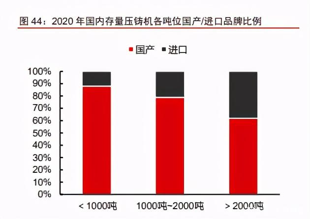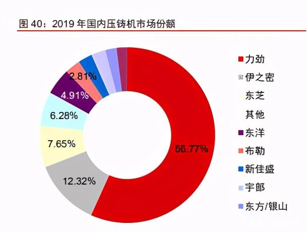 國產(chǎn)壓鑄機品牌具備明顯性價比優(yōu)勢,大型壓鑄機具有更好的盈利能力。國外品牌進口壓鑄機價格是國產(chǎn)品牌的 2~3 倍,國產(chǎn)化機型價格也至少是 國產(chǎn)品牌的 1.5 倍,國產(chǎn)品牌存在明顯性價比優(yōu)勢。中小型壓鑄機中,鎖模力 50 噸以下 基本為熱室機,單機價格在 15 萬以下。鎖模力 100 噸以上均為冷室機,其價格隨鎖模力 的增加同步上升。1000 噸以上大型壓鑄機價格增長幅度明顯加快,鎖模力高于 5000 噸的超大型壓鑄機裸機單價在 2500 萬以上,周邊配套設(shè)備組成的壓鑄島通常再增加 20%~30% 的費用,大型壓鑄機因技術(shù)壁壘高而具備更好的盈利能力。 冷室壓鑄機是市場的主要品類,國產(chǎn)機在大噸位領(lǐng)域仍有較大進口替代空間。2020 年我國存量壓鑄機從臺數(shù)上看,熱室機占比 25%,冷室機占比 75%。 但考慮到熱室機單價遠低于冷室機,從金額上估算冷室機占壓鑄機總市場規(guī)模的 85%以上。 從鎖模力噸位上看,1000 噸以下機型市場國產(chǎn)機占有近 90%的份額,進口機型在 2000 噸以上大型機領(lǐng)域仍占有近 4 成的份額,未來大型機國產(chǎn)化仍有較大空間。 從國內(nèi)市場競爭格局看,力勁在冷室機和熱室機領(lǐng)域均占有絕對主導地位。截至 2020 年力勁冷室機、熱室機在存量市場占有率分別為 49%和 63%。 冷室機領(lǐng)域 TOP5 廠商合計占有 79%的份額,除力勁外,伊之密占有 14%的份額,其次 為東芝 8%、東洋 5%,行業(yè)頂級品牌瑞士布勒在國內(nèi)份額 3%。熱室機領(lǐng)域 TOP5 廠商合 計占有 83%的份額,除力勁外,國產(chǎn)品牌震高、興行、銳達分別占有 7%、5%、5%的份 額,熱室機歐洲第一品牌瑞典富來在國內(nèi)占有 3%的市場份額。