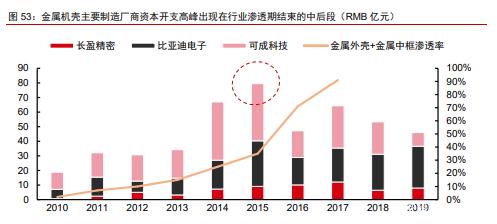 壓鑄模具行業(yè)競爭較為分散,目前我國沒有以壓鑄模具為主業(yè)的上市公司。根據(jù)壓鑄 模具行業(yè)調(diào)研信息,我國壓鑄模具行業(yè)收入最高的企業(yè)是廣州型腔,2019 年公司收入僅 2 億左右。其他規(guī)模較大的行業(yè)頭部企業(yè)有大連共立、寧波合力、一汽鑄造模具等企業(yè)。壓 鑄模具基本為非標產(chǎn)品,難以形成規(guī)模效應,同時下游客戶較為分散,是壓鑄行業(yè)市場規(guī) 模雖然較大但競爭格局分散的主要因素。 一體壓鑄車體滲透周期預計10~15年 手機結(jié)構(gòu)材質(zhì)從塑料變?yōu)榻饘伲饘俳Y(jié)構(gòu)件行業(yè)滲透率提升至 90%大致用時 7 年。2010 年蘋果從 iphone4 開始采用金屬機殼,并成功引領(lǐng)行業(yè)趨勢。2013 年 HTC 率先也 采用鋁合金外殼,2014 年國產(chǎn)智能手機品牌如小米、華為開始逐步在高端機種中采用金 屬機殼。至 2017 年,以金屬為主要結(jié)構(gòu)材質(zhì)的手機占比已達 90%,手機行業(yè)機殼金屬化 大致用時 7 年時間。 金屬機殼加工設(shè)備投資高峰出現(xiàn)在金屬機殼滲透率提升周期的中后段時間。金屬機殼 替代塑料機殼促使零部件企業(yè)大量采購 CNC。金屬機殼主要生產(chǎn)企業(yè)比亞迪電子、可成、 長盈精密在金屬機殼滲透率快速提升過程中均大量采購 CNC,固定資產(chǎn)支出同步上行。 2015 年設(shè)備采購高峰期三家公司合計資本開支近 80 億元,是 2010 年的 4.3 倍。比較金 屬機殼滲透周期和零部件企業(yè)設(shè)備投資周期,設(shè)備投資高峰出現(xiàn)在金屬機殼滲透率提升周 期的中后段時間。