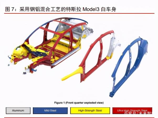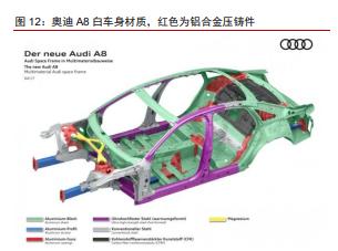當前供應鏈模式下,整車廠完成外覆蓋件沖壓、整車焊裝及噴涂,其余環(huán)節(jié)由零部件廠生產(chǎn)。外覆蓋件涉及到整車造型而由整車廠生產(chǎn)。除外覆蓋件外,整車廠通常將其他所有白車身、座椅、懸架結(jié)構(gòu)件的沖壓環(huán)節(jié)和組件焊接環(huán)節(jié)交由零部件供應商生產(chǎn)。整車廠將零部件廠生產(chǎn)的白車身組件,再與廠內(nèi)自產(chǎn)的外覆蓋件一起焊裝為白車身,而后噴涂、總裝,完成整車制造流程。 零部件廠生產(chǎn)白車身組件生產(chǎn)采用沖壓+機器人焊接工藝。白車身組件外形結(jié)構(gòu)復雜,無法用單一板材直接沖壓成型,目前普遍采取沖壓成多個小零件再焊接的模式生產(chǎn)。先由壓力機將板材沖壓成多個小鈑金零件,再通過機器人焊接工作站,采用電阻焊(點焊)的工藝焊接成整塊組件。上述產(chǎn)品通常由零部件公司生產(chǎn),并出貨至整車廠。 整車廠制造白車身整車普遍采用機器人焊接工藝。整車廠將零部件廠生產(chǎn)完成的白車身組件與整車廠內(nèi)自產(chǎn)的外覆蓋件一起焊接而成整車白車身產(chǎn)品。白車身整車焊裝通常采用上百臺大型工業(yè)機器人采用以電阻焊為主的焊接工藝生產(chǎn)。目前業(yè)內(nèi)一條產(chǎn)能在50JPH(每小時生產(chǎn)50輛車)的白車身焊接線,通常需要300~400臺工業(yè)機器人。 傳統(tǒng)沖壓焊接工藝模式加工鋁合金難度較大,全鋁車身普及受限。白車身采用鋁合金替代鋼材通常可使自重降低1/3左右,從而減少油耗或電池用量。上世紀90年代,奧迪 最先在A8系列轎車采用全鋁車身,使其白車身重量由原先300kg以上降至215kg。過去十年新能源車崛起,通過車身減重來降低電池裝用量成為新能源車降本重要手段,特斯拉Model S、蔚來ES8等車型均采用全鋁車身。但鋁合金表面高熔點氧化層影響焊接強度、韌性較低影響沖壓效果。以奧迪A8為例,其全鋁車身制造通常需要包括點焊、激光焊、渦流焊、鉚接、自切削螺釘聯(lián)接、卷邊等14種連接工藝,制造工藝復雜度遠高于以電阻焊為主的鋼制白車身。因此近年來包括特斯拉在內(nèi)的各大車企主要采用鋼鋁混合焊接車身。減重性能更好的全鋁車身在現(xiàn)有沖壓+機器人焊接的工藝模式下預計難以普及。