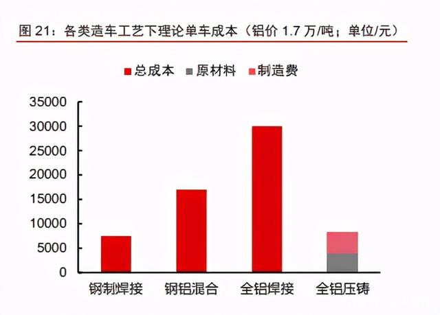 一體壓鑄工藝是汽車制程中的顛覆性技術(shù),壓鑄機有望成為汽車制造領(lǐng)域的核心裝備。從上世紀初焊接技術(shù)逐步成熟以來,汽車車體制造工藝均以鈑金沖壓+焊接為主。上世紀 70 年代以前,汽車車體焊接主要由人工作業(yè)完成。20 世紀 70 年代數(shù)控技術(shù)逐步成熟,工 業(yè)機器人誕生,最早應用于汽車焊接工藝。過去 50 年間,汽車車身制造工藝始終以鈑金 沖壓+機器人焊接為主。本次特斯拉一體壓鑄技術(shù)有望使汽車車體制造工藝重大變革,壓 鑄機有望取代焊接機器人成為造車核心裝備。 二、一體壓鑄車身工藝具備極高經(jīng)濟性 特斯拉 Model Y 一體壓鑄后車身成本下降 40% Model Y 一體壓鑄后車身成本下降 40%,零部件減少 79 個。2020 年特斯拉電池日 上,公司介紹稱 Model Y 后車身結(jié)構(gòu)件采用新型一體壓鑄工藝后,成本較沖壓-焊接工藝 降低 40%,并且零件減少 79 個。一體壓鑄降低車體制造成本大幅降低,優(yōu)化生產(chǎn)流程。 理論上可使全鋁車身成本下降 73% 1、 鋼制焊接車身:合資品牌國產(chǎn)化的以鋼制為主的主流 B 級車 焊接白車身成本大概在 7000~7500 元/臺左右。 2、 鋼鋁混合焊接車身:2019 年廣汽蔚來發(fā)布的合創(chuàng) 007 采用鋼鋁混合車身打造,發(fā)布 會介紹其車身成本為 16529 元。鋁合金價格已從 2019 年底的 1.5 萬上漲至近期 1.7 萬元,可以大致推算采用焊接工藝的全鋁車身造價在 1.5 萬~2 萬元/臺左右。 3、全鋁焊接車身:某外資品牌國產(chǎn)化全鋁車身的 D 級車焊接白 車身成本大概在 4 萬元以上。國產(chǎn)的某款用鋁量高于 90%的 SUV 全鋁車身制造成本 在 3 萬左右,加上四門兩蓋價格約 4 萬。考慮到該款 SUV 白車身重量達 350kg 偏重, 優(yōu)化設(shè)計后,主流 B 級車全鋁車身焊接白車身成本估算在 3 萬元/臺。 4、壓鑄全鋁車身:普通 B 級車鋼制白車身重量通常在 300~400kg,鋁替代鋼可使白車身 重量降低 30%~40%。以 D 級車的奧迪 A8 為例,其全鋁架構(gòu)的 D4 型號白車身重量在 231kg。同時特斯拉下一代全鋁壓鑄底盤較焊接底盤減重 10%,可以大致推算出如果 全部采用壓鑄工藝的 B 級車的白車身含車門大致重量在 200~250kg。制造成本方面, 根據(jù)以壓鑄鋁合金汽車零件為主業(yè)的文燦股份招股書所示,2017 年鋁合金壓鑄件成本 大約在每公斤 35 元。當前鋁價與 2017 年類似,可大致算出全鋁壓鑄車身理論成本在 8200 元/臺左右,如果以滿負荷產(chǎn)能利用率的生產(chǎn),制造成本還有進一步下降空間。
