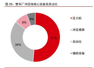 壓鑄廢品、流道等可再次熔煉,材料利用率超 90%,遠高于沖壓。傳統(tǒng)沖壓-焊接工 藝,通常板材利用率僅為 60%~70%,沖壓剩余邊料只得按廢舊金屬出售。而改為一體壓 鑄后,因壓鑄時可反復熔煉,因此廢品、壓鑄流道、邊料等廢料可返回熔煉爐再次利用。 壓鑄工藝對材料利用率在 90%以上,遠高于沖壓工藝,再次降低生產(chǎn)商成本。 車身生產(chǎn)車間占地面積減少 30%以上。相較于 300 多臺機器人組成的白車身焊接線, 一體壓鑄工藝采用的壓鑄島占地面積更小。特斯拉采用壓鑄工藝的新工廠占地面積節(jié)省 35%。同時因生產(chǎn)流程簡化,原先由零部件廠供應的組件沖壓、組件焊接環(huán)節(jié)取消,相關(guān) 場地同時不再需要,更進一步降低全產(chǎn)業(yè)鏈的用地面積。 三、一體壓鑄車身趨勢下,壓鑄機和壓鑄模具成為核心造 車裝備 傳統(tǒng)沖壓-焊接白車身制造設(shè)備主要為壓力機、沖壓模具和工業(yè)機器人 傳統(tǒng)沖壓-焊接白車身制造設(shè)備主要為壓力機、沖壓模具和工業(yè)機器人。在沖壓環(huán)節(jié)分 為整車廠采購的外覆蓋件壓力機和零部件廠采購的車身結(jié)構(gòu)件組件壓力機。二者通過更換 不同的沖壓模具可實現(xiàn)多種外觀尺寸沖壓件生產(chǎn)。因外覆蓋件尺寸通常大于 800mm 以上, 對應需要多臺大型壓力機組連續(xù)沖壓成型,其上下料環(huán)節(jié)基本采用機器人自動化來實現(xiàn)。 而拼焊前的車身結(jié)構(gòu)件小件尺寸通常不超過 300mm,一般采用小型壓力機和中小型機器 人自動化生產(chǎn)系統(tǒng)。 產(chǎn)能 40JPH 外覆蓋件沖壓線單線投資 3~4 億,結(jié)構(gòu)件小件沖壓線投資約 2.5 億。目 前業(yè)內(nèi)單條外覆蓋件連續(xù)沖壓線效率在 12spm 左右(沖壓 12 次/分鐘)。一臺整車外覆蓋 件數(shù)量通常在 12~17 件,加上模具更換時間,單條外覆蓋件沖壓線折算整車產(chǎn)能在 40JPH 左右(每小時生產(chǎn) 40 輛車)。一條產(chǎn)能 40JPH 外覆蓋件連續(xù)沖壓線 總投資額在 3~4 億元,其中壓力機約 1.8 億、模具 1.2 億、機器人自動化系統(tǒng) 0.3 億,輔 助設(shè)備 0.2 億。零部件廠生產(chǎn)的車身結(jié)構(gòu)件小件,相同產(chǎn)能沖壓 設(shè)備總體投資約為整車廠外覆蓋件沖壓設(shè)備投資的 70%。