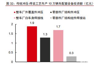 產(chǎn)能 10 萬輛/年的沖壓線設(shè)備投資 2.5 億,估算全球沖壓線設(shè)備總投資額 2900 億元。 單線產(chǎn)能 40JPH 的外覆蓋件+車身結(jié)構(gòu)件小件沖壓設(shè)備投資總計約 6 億元。若按每天生產(chǎn) 20 小時,一年工作 300 天計算,則對應產(chǎn)能 10 萬輛/年的沖壓線對應設(shè)備總投資額約 2.5 億元。按照產(chǎn)能/產(chǎn)量余量 30%計算,則中國年產(chǎn) 2500 萬輛汽車對應沖壓設(shè)備總投資額在 806 億元,全球年產(chǎn) 9000 萬輛汽車對應沖壓設(shè)備總投資額在 2900 億元。 產(chǎn)能 50JPH 白車身焊接線投資在 4 億左右,配套組件焊接設(shè)備投資約 0.8 億。零部 件廠的車身結(jié)構(gòu)件組件焊接通常采用 2~3 臺機器人組成的點焊工作站完成生產(chǎn)。而整車廠 的白車身焊接線為 300 臺以上的大型工業(yè)機器人多工位連續(xù)焊接,工藝流程最為復雜,單 線產(chǎn)能約 50JPH。除機器人外,車體滾床線、電阻焊焊鉗、車體夾爪夾具、涂膠設(shè)備也是 白車身焊接線的重要組成設(shè)備。整車廠一條產(chǎn)能 50JPH 的白車身自 動焊接線大約需要 350~400 臺工業(yè)機器人,總投資額在 4 億元左右。零部件廠主要將沖 壓成型的車身結(jié)構(gòu)件小件焊接成組件,以 2~3 臺機器人焊接工作站為主。相同配套產(chǎn)能焊 接設(shè)備總體投資約為整車廠白車身焊接線投資的 20%。 產(chǎn)能 10 萬輛/年的沖壓線設(shè)備投資 2.1 億,估算全球沖壓線設(shè)備總投資額 1872 億元。單線產(chǎn)能 50JPH 的白車身焊接線+車身結(jié)構(gòu)組件焊接設(shè)備投資總計約 4.8 億元。若按每天 生產(chǎn) 20 小時,一年工作 300 天計算,則對應產(chǎn)能 10 萬輛/年的沖壓線對應設(shè)備總投資額 約 1.6 億元。按照產(chǎn)能/產(chǎn)量余量 30%計算,則中國年產(chǎn) 2500 萬輛汽車對應沖壓設(shè)備總投 資額在 520 億元,全球年產(chǎn) 9000 萬輛汽車對應沖壓設(shè)備總投資額在 1872 億元。 傳統(tǒng)沖壓+焊接工藝,年產(chǎn) 10 萬輛車的產(chǎn)能設(shè)備總投資約 5.2 億元。根據(jù)上述分析測 算結(jié)果,采用傳統(tǒng)沖壓-焊接工藝年產(chǎn) 10 萬輛車,整車廠的沖壓和焊接投資額分別為 1.9 億和 1.7 億,零部件廠的沖壓和焊接投資額分別為 1.3 億和 0.3 億,整車廠和零部件廠總 投資約 5.2 億元,整車廠的單位產(chǎn)能設(shè)備投資是零部件廠焊接投資的 2.3 倍。中國 2500 萬輛年產(chǎn)能的相關(guān)沖壓+焊接設(shè)備總投資額約 1300 億元,全球 9000 萬輛車年產(chǎn)能的相關(guān) 沖壓+焊接設(shè)備總投資額約 4680 億元。