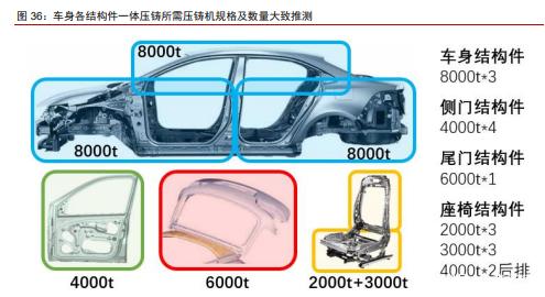 一體壓鑄車身趨勢下,壓鑄機和壓鑄模具成為核心造車裝備 一體壓鑄工藝將主要取代白車身、四門、后蓋結(jié)構(gòu)件的沖壓和焊接環(huán)節(jié)。根據(jù)特斯拉 現(xiàn)有一體壓鑄工藝和訪談相關(guān)產(chǎn)業(yè)專家,未來整車采用一體成型壓鑄工藝趨勢下,除外覆 蓋件需要沖壓外,其余車身、四門、后蓋結(jié)構(gòu)件的沖壓和焊接環(huán)節(jié)均可被壓鑄工藝替代。 整車白車身焊接線大幅簡化,僅保留最后一體壓鑄件和外覆蓋件焊接環(huán)節(jié)。座椅內(nèi)部結(jié)構(gòu) 件是否采用壓鑄工藝鋁代替鋼材目前還在探討中。懸架件中的副車架、前橫梁、擺臂等件 若采用鋁替代鋼,通常會采用適應厚壁零件的低壓鑄造工藝。 我們測算若實現(xiàn)全底盤和全車身壓鑄,單套壓鑄島投資區(qū)間在 1.5~2.5 億。壓鑄機鎖 模力噸位大小取決于所壓鑄材料投影面積大小。當前特斯拉已實現(xiàn)的 Model Y 車后部區(qū) 域采用 6000 噸級壓鑄機實現(xiàn)生產(chǎn)。根據(jù)行業(yè)調(diào)研信息做合理推斷分析,若實現(xiàn)全底盤壓 鑄,我們分析有 A\B 兩種壓鑄機選型方案。A 方案可以采用 2 臺 6000 噸壓鑄機分別生產(chǎn) 車體前后部,車體中部由 1 臺 8000 噸級壓鑄機生產(chǎn),按現(xiàn)在市場價估算含周邊設(shè)備的壓 鑄島投資約 1.5~2 億。B 方案可以采用 2 臺 8000 噸壓鑄機實現(xiàn)生產(chǎn),投資也在 1.5~2 億。 若要實現(xiàn)全車壓鑄,則需要另增加一臺 8000噸級壓鑄機實現(xiàn) A\B\C柱和頂蓋的一體壓鑄, 總投資約 2~2.5 億,或采用更激進的將整車底板用一臺壓鑄機完成,則需要 1.5 萬噸級壓 鑄機,目前尚無該規(guī)格設(shè)備,價格估算需要 2~3 億。 壓鑄機產(chǎn)能約 12 萬件/年,全車結(jié)構(gòu)件一體壓鑄需要從 2000~8000 噸多種規(guī)格。根 據(jù)壓鑄機行業(yè)專家調(diào)研信息,5000 噸以上超大型壓機單次工作循環(huán)在 180s 左右。若按每 天生產(chǎn) 20 小時、一年工作 300 天計算,則單臺壓鑄機產(chǎn)能在 12 萬件/年。根據(jù)現(xiàn)有技術(shù) 推算,全車體結(jié)構(gòu)件壓鑄需要 3 臺 8000 噸級壓鑄機,單車 4 個側(cè)車門結(jié)構(gòu)件壓鑄需要 4000 噸級壓鑄機,尺寸較大的尾門需要采用 6000 噸壓鑄機。座椅結(jié)構(gòu)件如果也采用一體壓鑄 工藝,兩個前座、后排單座的靠背和底座分別需要 3000\2000 噸壓鑄機,后排雙連座椅靠 背和底座則需要 2 臺 4000 噸壓鑄機生產(chǎn)。