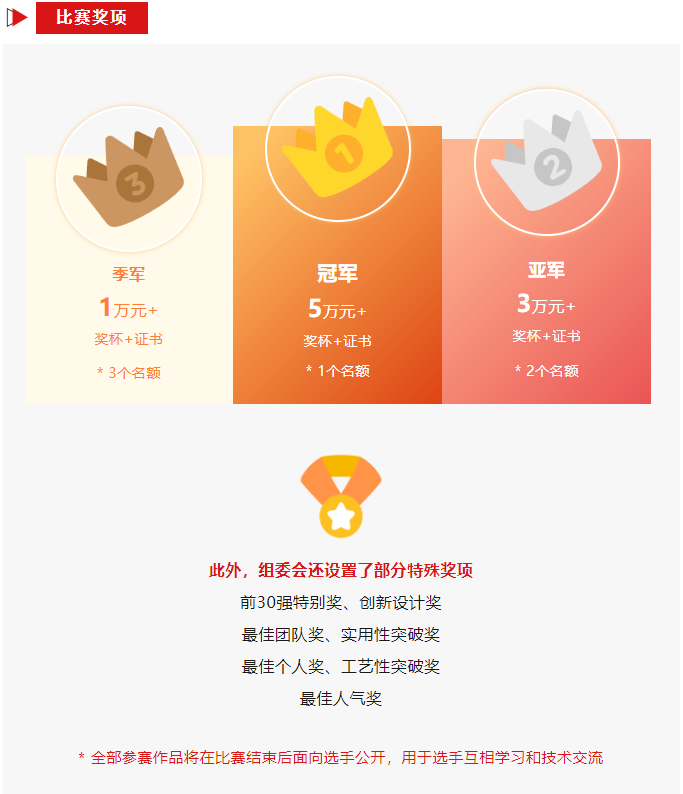 報名渠道: 02初賽階段 2023年7月17日-8月31日 大賽考題將于7月17日當天發布,選手需根據考題和賽制規則在8月24日前完成作品并提交;8月25日-31日期間將進行行業公開投票和專家打分,前10強將入圍決賽,展開最終角逐。 03決賽階段 2023年9月2日(暫定) 預計定于寧波市北侖區(具體時間地點請等待官方正式通知),選手需對參賽作品進行現場答辯,專家評審提問并進行現場打分,最終出爐1名冠軍、2名亞軍和3名季軍,現場頒發獎項。