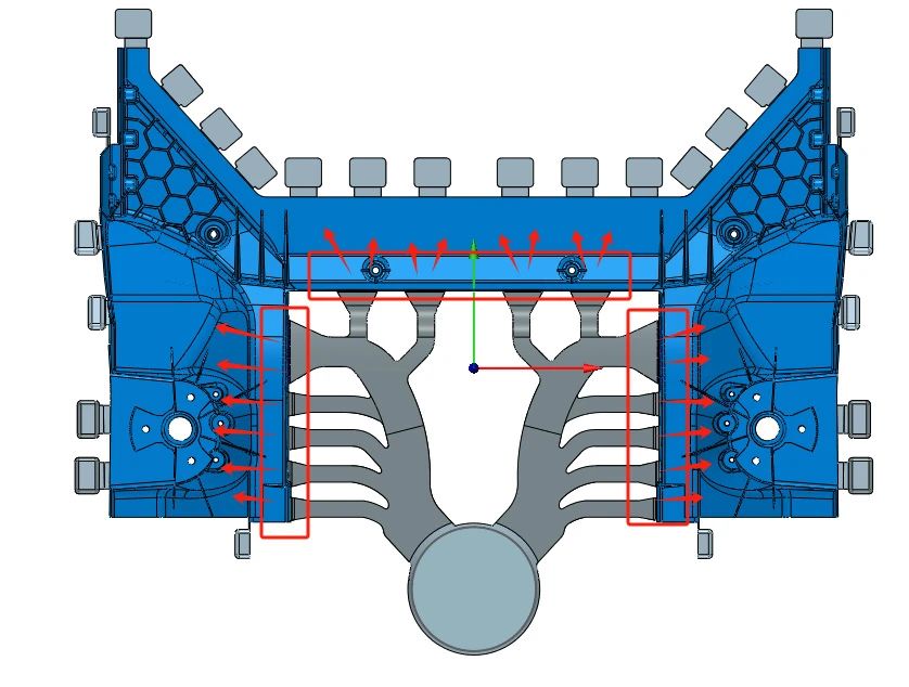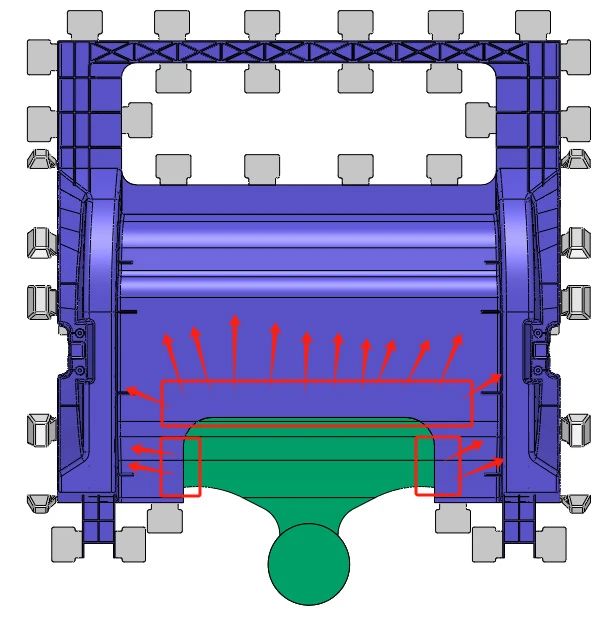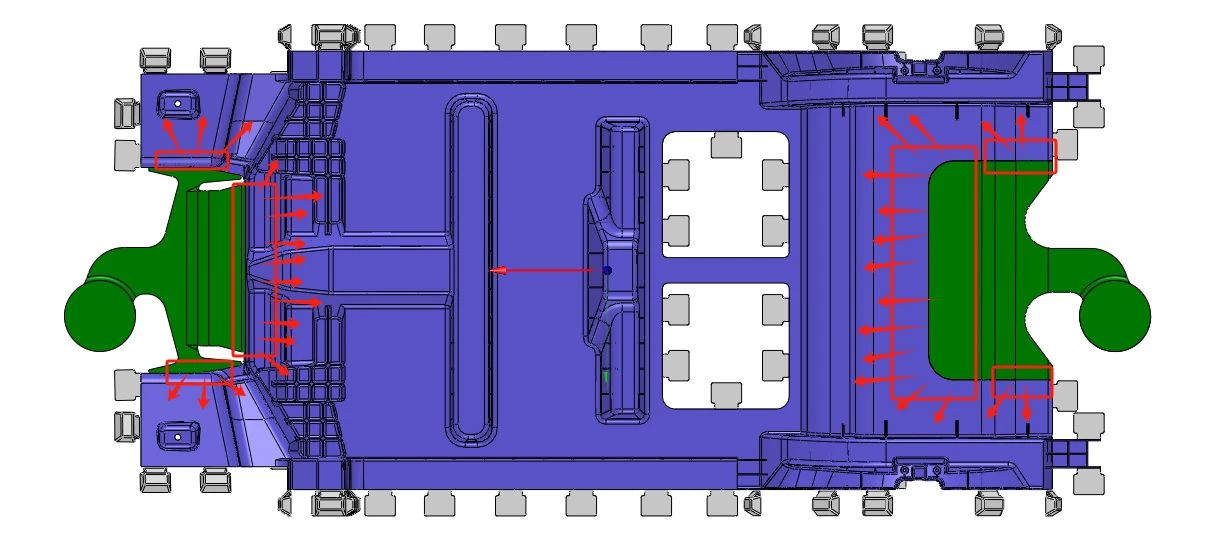 圖 7 由紅色線區域進澆填充到遠端距離相對合理,流向和排氣往外走勢,但是,流道兩側會很長(沖頭到澆口 行程)。過程能量損耗大,不利于成型(圖 7)。 方案 2. 如圖 8 所示進澆位置