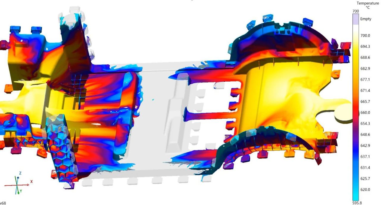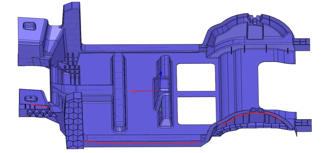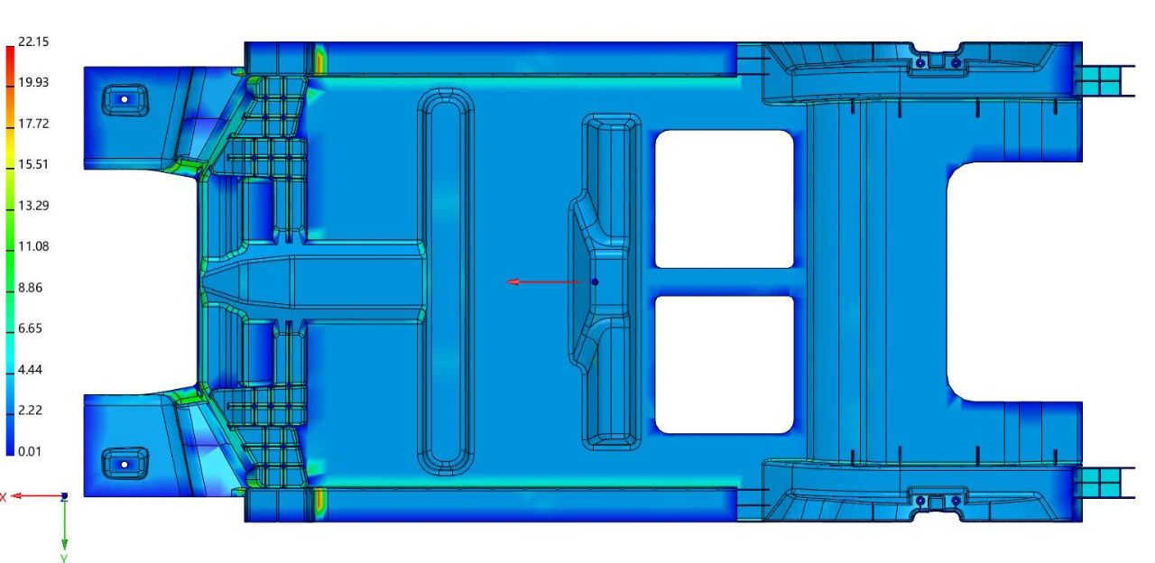 圖 14 通過觀察成型不良模擬結果組別(圖 13)發現下地板成型不良缺陷位置除了前面分析過的兩側高塔和輪罩 位置外,還存在于產品中間位置。如(圖 14)所示金屬液從兩側進行壓射,一方面產品中心位置最后成型位 置,從另一方面來看同時也是兩側金屬液交匯碰撞的位置,從(圖 13)結果中可以觀察到中間碰撞位置出現明 顯的充型漩渦。