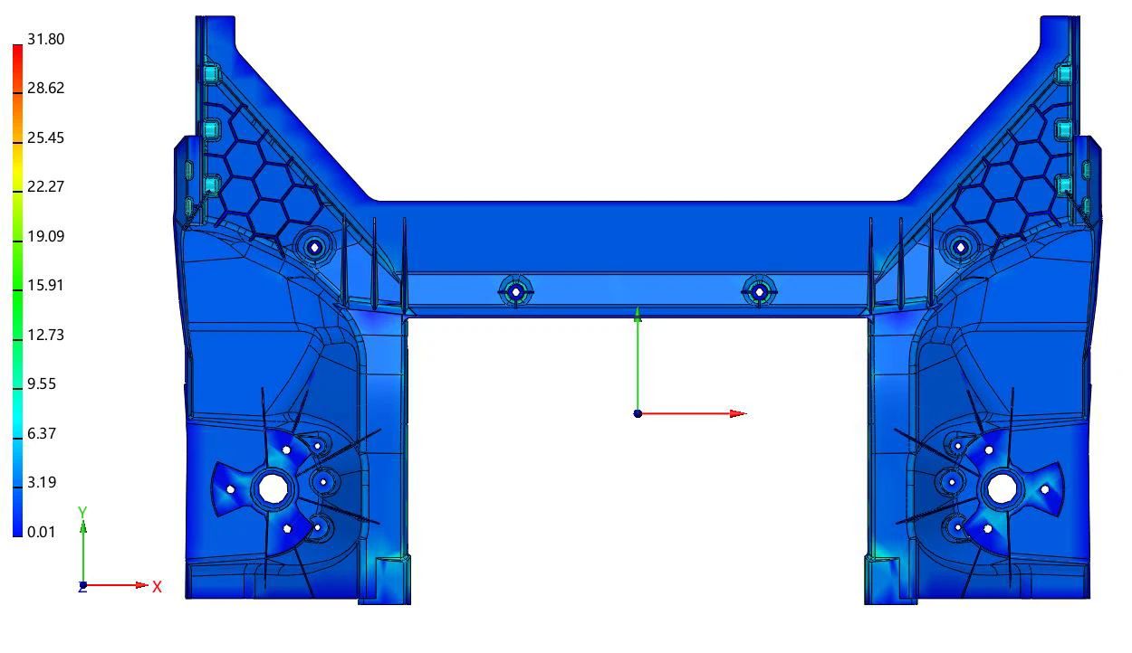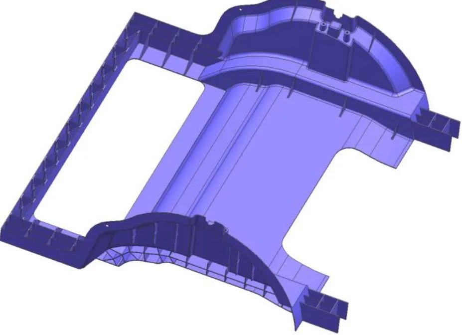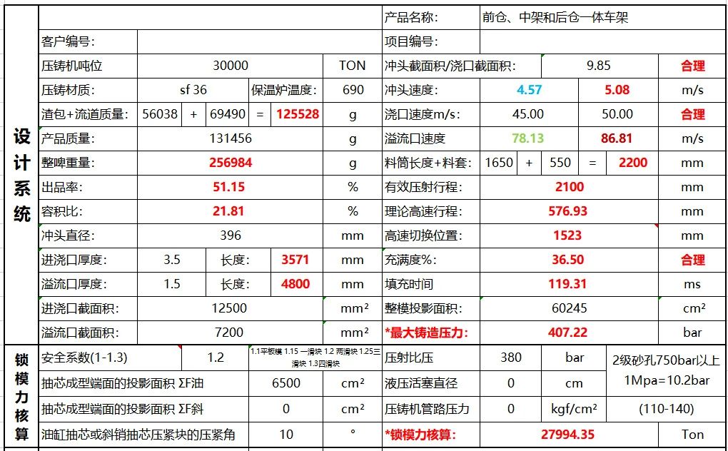 相關的速度為 50 米/秒,填充時間 0.119 秒,由于是使用雙沖頭(直徑 280mm,雙沖頭 280mm 面積約等于 396mm 沖頭面積)壓射,填充速度和時間或許和相關理論有輕微偏差。 三、模擬分析 如大家所知,壓鑄是一個涉及很廣,包含全面,由多部門、多產業通力合作的行業。簡單的來說,包含了 前期的產品結構設計,然后再到壓射方案設計,再到壓鑄現場進行工藝參數設置調整優化等。從模擬仿真角度 同樣具備精細的分門歸類,分成了不同的結果組別,有的結果組別是應用于產品結構設計,有的結果組別是應 用于壓射方案設計,有的結果組別是應用于工藝參數優化。在本文中將結合模擬案例重點闡述應用于壓射方案 設計組別和工藝參數調整組別的模擬結果。 三.1 前機艙方案成型分析