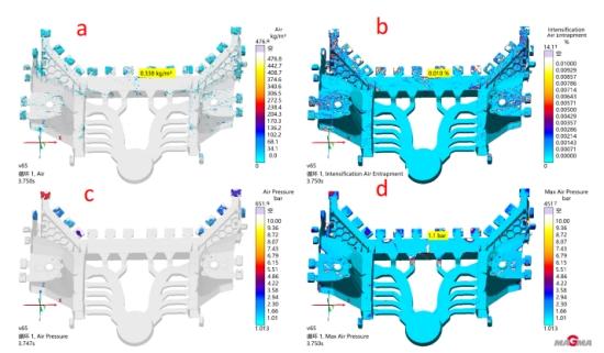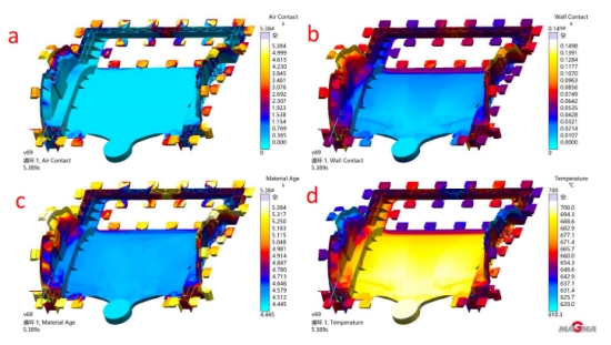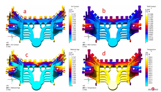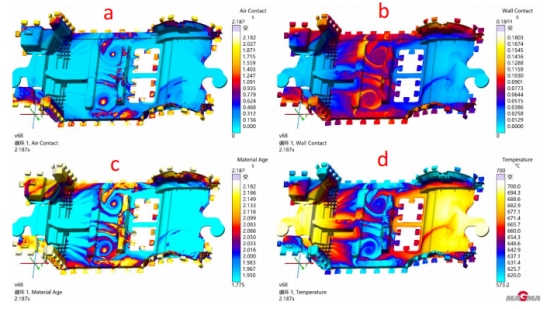 圖 9 如圖 9 模擬結果組主要為通過模擬軟件分析產品成型不良的相對應結果組別。其中圖 9a 是空氣接觸結果, 空氣接觸主要反應金屬液在充型的過程中,模具型腔內氣體最后滯留的地方。如圖所示,我們可以看到亮色的 位置,就是氣體滯留時間最長的地方,也就是最后充型的地方,主要集中在產品左右兩側的高塔位置和產品尾 端。圖 9b 結果為型壁接觸結果,主要反饋出在壓射成型的過程中,模具表面的水蒸汽、油污等之類最后匯聚的 地方,如圖所示,模擬結果亮色的位置就是這些油污最后積聚的地方,嚴重影響產品的機械性能。 圖 9c 是材料 年齡結果,主要反饋金屬液在充型的過程中,由于充型時間久而伴隨著溫降幅度大,最后形成大量冷料積聚的 位置。圖 9d 為成型溫度結果,結果顯示暗色(藍色)的區域表示成型溫度低,成型不良的風險大。 圖 9 所示的結果組別主要都為基于目前產品的結構和成型方案反饋出的成型困難和成型尾端的位置,也就 是目前現有的澆注系統難以輻射到的地方。具體到前機艙產品,我們通過模擬可以發現成型不良的位置主要有 兩處,一處在兩側高塔端部,此兩處位置金屬液在成型的過程中需要爬坡,從而導致充型困難。另一處為產品 進澆的尾端,金屬液充型后期伴隨著充型能量的下降,從而出現以上結果所描述的問題。主要的缺陷為成型不良,表現最嚴重的會出現冷裂,最輕微的產品表面會出現流痕,從而影響產品力學性能。