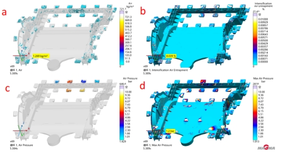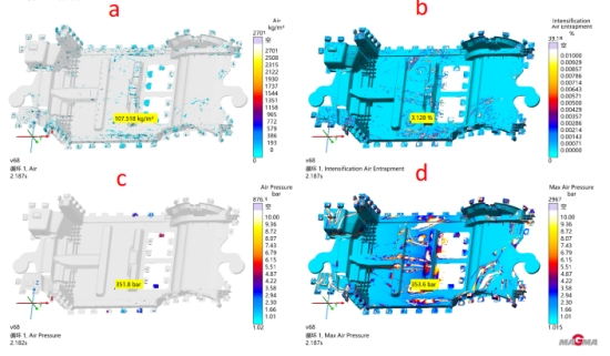 圖 10 如圖 10 模擬結果組別主要應用于現場工藝參數優化的組別。其中圖 10a 為氣體結果,主要是從兩個角度來 闡述:第一個角度是隨著金屬液在充型的過程中,型腔里面的氣體的去處,沒有被排出型腔,還是滯留在型腔 里面的某個位置;第二個的角度就是滯留氣體密度的高低,同時也是氣體這個結果的單位,高氣體密度位置相 對應的氣體缺陷風險大,而低氣體密度位置,雖然有氣體滯留,但是風險相對較小。圖 10b 結果是增壓卷氣, 通常與圖 10a 結果結合一起觀察,我們通過圖 10b 結果發現在充型過程中卷氣的具體位置,然后再通過圖 10a氣體結果的動態變化過程來觀察卷氣是如何形成的,比如是從模具型腔其它位置轉移過來,還是一直被困住出 不去最后再把密度和百分比結合來綜合判斷風險性高低。圖 10c 模擬結果呈現出在充型的過程中型腔內氣壓 的變化過程,在什么位置和什么時間形成的高氣壓,通常與圖 10d 最大氣壓這個結果合同使用。其兩者之間的關系為圖 10c 會顯示出充型過程中會形成高氣壓的位置和時間段,最后將不同時間段的高氣壓匯總成在一個結果中,這就是最大氣壓結果。最大氣壓位置就是困氣處,在正常的情況下,型腔內氣體為一個標準大氣壓,被 困氣體在被金屬液擠壓的過程中形成高氣壓,從而產生氣孔缺陷的風險。 圖 10 所示的結果組別主要都為基于目前產品的結構,方案設計和工藝參數所反饋出的氣體缺陷風險位置,也就是排氣困難,或由于高速切換位置及高速速度形成的金屬液翻滾等造成包氣,卷氣和憋氣等。具體到前機 艙產品,我們通過模擬發現氣體風險位置主要集中在兩側高塔端部,產品進澆的尾端。通過觀察充型過程發現,金屬液在內澆口位置高速充型形成卷氣,最后此些氣體伴隨著充型最后滯留在最后成型的位置。主要的缺陷為氣體缺陷結果,可以通過探傷進行檢測觀察,此缺陷會影響產品力學性能。 三.2 后地板方案成型分析