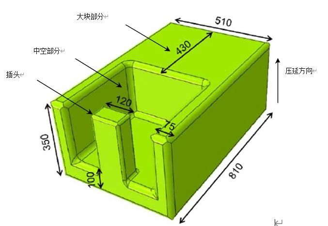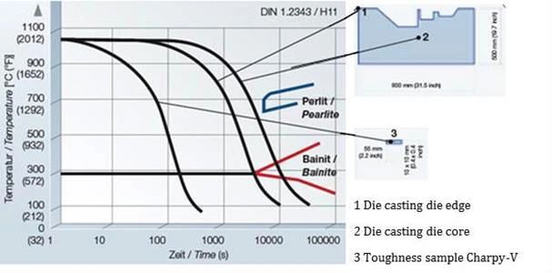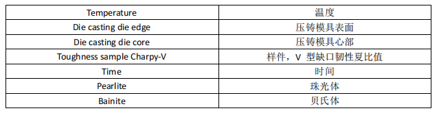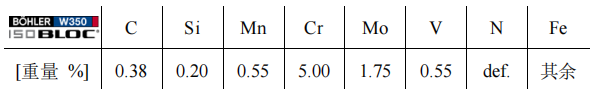 圖 16:H11 型 熱作模具鋼的 CCT 圖(連續冷卻轉變曲線)模具尺寸對冷卻速率的影響[10]。 然而相關文獻中,幾乎無法找到冷卻速率對5% 鉻熱作模具鋼大尺寸樣件的顯微組織以及機械性能的影響。因此,我們眼前的工作將著重研究具有不規則的幾何結構,尺寸為810 x 510 x 350 mm 的大塊樣件,就像壓鑄模具使用的鋼材一樣。我們以壓鑄模具應用的規范條件,對該樣件進行熱處理,隨后將樣件鋸開以確認材料的斷裂韌性,并分別檢測不同冷卻速率區域的缺口沖擊韌性。最后,采用光學顯微鏡和掃描電鏡 (SEM) 對其顯微組織進行研究,并通過數字模擬計算,得出鋼材在多種冷卻速率下的相的百分比。 該大尺寸的實驗模具鋼的等級為 X38CrMoV5-1。此鋼種的化學成分可參見表 7 。該材料是奧地利卡普芬貝格的 Böhler Edelstahl 鋼廠以工業規模生產的鋼材,名稱為 W350 ISOBLOC,它具有出色的淬透性,非常適合用于超大尺寸的壓鑄模具 。 表 7. Böhler W350 ISOBLOC 鋼的化學成分(重量 %)