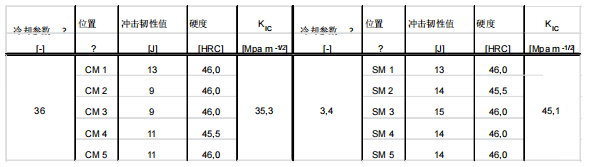 圖 18:用于機械實驗的單個試樣的位置。 對于所研究的冷卻參數:核心 (λ = 36) 和插頭(λ = 2.6),其對應的顯微組織是通過 DEFORM (Design Environment Forming) 模擬軟件進行數字計算的。為了執行準確的形變熱處理模擬,需要掌握“溫度和相變的關聯”方面的材料性能知識,這些知識以及所用的數字模型均基于 Schemmel 等人的研究 [12]。他用同一鋼種,以不同尺寸的試樣,來計算其在淬火過程中殘余應力和相的百分比的形成和演變。對相變動力學的正確描述是一個先決條件。值得注意的是,數字計算的結果僅可作為參考值。 匯總了材料大塊的心部 (CM) 和大塊區域表面 (SM) 的機械實驗結果。和預期的一樣,心部 λ=36 比表面區域 λ=3.4 的冷卻參數要高得多。一般來說,這就會導致 CM 的 KIC 值 (35.3 MPa m-1/2) 和沖擊韌性 (~10 J) ,要比 SM 的 KIC 值 (45.1 MPa m-1/2) 和沖擊韌性 (~14 J) 更低。材料大塊的兩個位置都達到了 ~46 HRC 的硬度值。圖 19,顯示了冷卻參數對材料顯微組織的影響。由此可以看出,CM 的顯微組織由回火馬氏體和貝氏體混合組成,而 SM 恰好相反,它完全呈馬氏體組織。根據 ASTM E112 的標準,兩個位置的晶粒尺寸可以評定為 9 級。 表 8. CM 和 SM 位置的沖擊韌性、硬度和斷裂韌性。