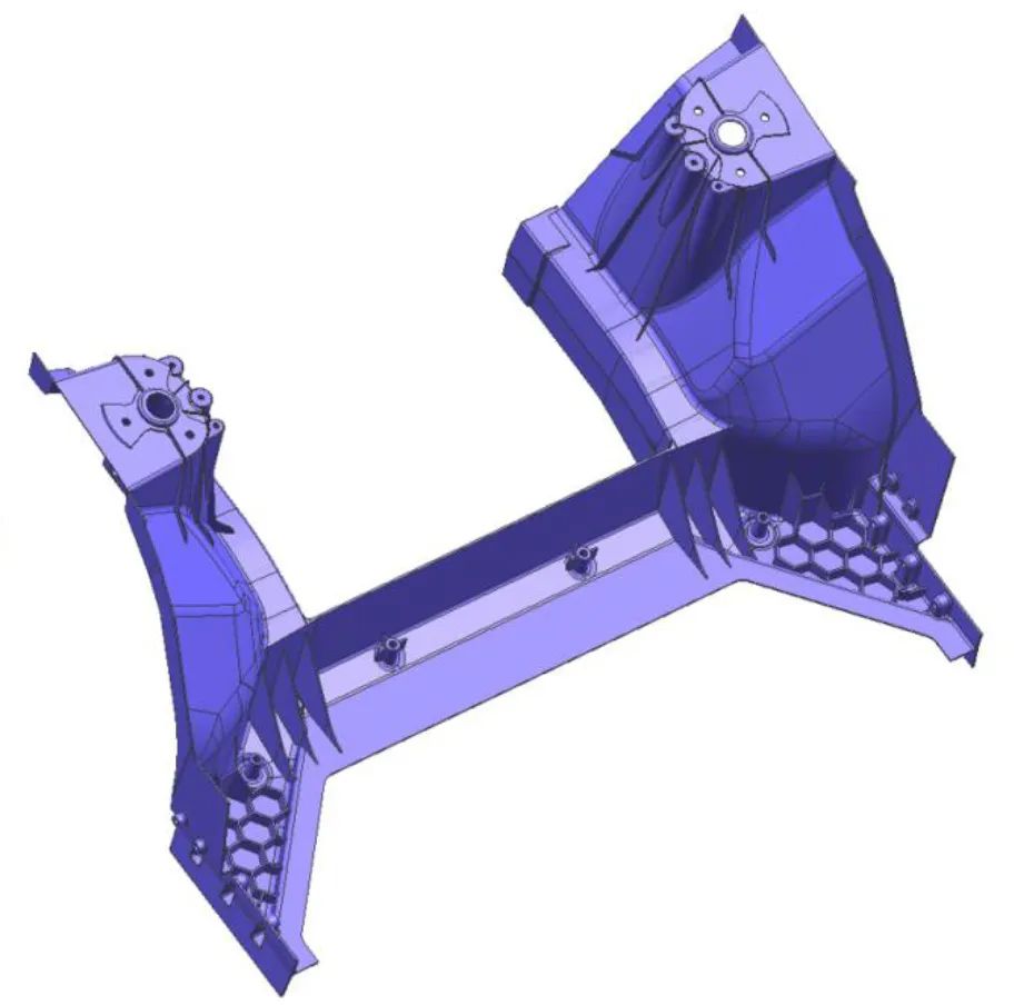 圖1 一、合金材料 傳統車身結構件主要應用 Silafont-36 合金,通過高真空壓鑄+熱處理達到零部件的使用性能要求。但對于一體壓鑄大型薄壁車身結構件,零件集成度更高,尺寸更大,結構更復雜,而熱處理易引起零件變形和表面起 泡,難以達到尺寸精度和裝配要求,造成零部件報廢,如后續進行矯形和修整,則增加生產工序,提高生產成本,不利于節能減排。因此,開發一體化壓鑄車身結構件用免熱處理高強韌鋁合金材料是超大型一體化車身結 構件發展的關鍵之一。 免熱處理的壓鑄鋁合金材料,一般是指合金在鑄態下具備高強高韌特性,且合金有較低的析出強化能力。1990 年前后,德國萊茵公司推出兩款免熱處理壓鑄鋁合金材料:Castsail37 合金(Al9SiMnMoZr)與Magsimal59(Al5Mg2Si)合金。但由于以上兩款合金對工藝的敏感性高,增加了整個鑄件生產的控制難度。且Castsail37 合金含 Mo、Zr 等高成本的元素,Al-Mg 體系的 Magsimal59 合金則增加了熔煉、模具設計的要求。這 些問題限制了當時非熱處理壓鑄鋁合金的發展。隨著電動汽車對輕量化及零件集成設計的需求增加,大噸位壓 鑄機設備,模具設計,工藝控制等技術能力顯著提高,免熱處理壓鑄鋁合金再次成為關注的熱點并實現超大型 一體化車身結構件的批量生產。某新能源車企開發了適用于一體壓鑄大型車身結構件的免熱處理鋁合金材料, 并成功應用于其產品。美國鋁(C611)、國內上海交大開發的免熱鋁合金材料也已經在超大型一體化車身結構件 實現量產應用。立中集團、瑞格金屬、湖北新金洋、重慶順博等也在進行免熱處理鋁合金材料的開發及產業化 推廣應用工作。 從材料角度而言,共晶組織的控制是決定合金性能的關鍵之一。高效、長效的變質劑可以使鑄態共晶組織保持細小彌散,從而提高合金性能。從經濟性角度考慮,超大型一體化鑄件中的生產過程中需要引入回爐料,再生料等降低鋁錠成本。但回爐料的使用容易造成雜質元素的超差引入,從而帶來的組織粗化,造成合金性能的降低。因此,免熱處理壓鑄鋁合金需要具備更高雜質元素的容忍度確保達到鑄件性能要求。在保證鑄件中組織特征的情況下,超大型一體車身結構件在使用過程中要有足夠的強韌性保證鑄件的疲勞耐久,碰撞等要求。 同時為了保證鑄件與周邊環境的連接,會采用 SPR、點焊、膠結等工藝。因此,材料需具備更高的連接包容性。另外,超大型一體化鑄件結構復雜、充型距離遠,要求材料具有更高的流動性、更低的收縮率等。因此,優異的服役性能是非熱處理高強高韌壓鑄鋁合金工程化應用的基礎條件。與此同時,從設計與工藝角度而言, 完整的物性數據庫與材料卡片是免熱處理壓鑄鋁合金材料融入零件結構設計與模具設計的必要條件。而適合于 材料特性的工藝控制方案則是發揮材料潛能的關鍵手段。只有通過以上環節之間的緊密配合方能真正實現工業 化應用。 二、方案設計 二.1. 前機艙排位方案分析