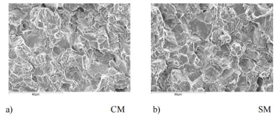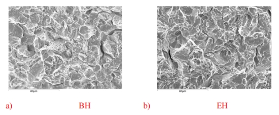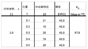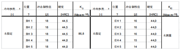 圖 20:材料大塊位置,a) CM 和 b) SM 的斷裂面分析。 圖 20 顯示了,材料經沖擊實驗后,通過掃描電鏡觀察到的斷口形貌。不同的冷卻參數和與其對應的不同的 顯微組織,會對斷裂類型造成微小的變化。CM 斷裂面呈現穿晶斷口的特征,是由于該位置出現了貝氏體。SM的斷裂類型則表現為明顯的沿晶斷裂,該位置呈現出完全的馬氏體組織??梢灶A料,這會與模具在該部分的沖擊韌性和斷裂韌性值密切相關。 這里未對該部位的冷卻參數進行研究,因為對于所用的真空爐,可供測量淬火速率的位置只有 3 個。筆者假定,中空部分的冷卻參數和大塊部分表面區域 (SM) 的冷卻參數相似。 表 9. 位置 BH 和 EH 的沖擊韌性、硬度和斷裂韌性。