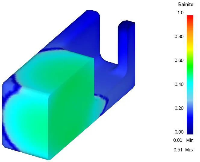 a) b) 圖 24:a) 貝氏體和 b) 馬氏體的體積分數的數值計算。 眾所周知,淬火速率對熱作模具鋼的機械性能影響最為顯著,它對材料強度和形變特性上的區別甚微。但材料的斷裂韌性和沖擊韌性極大地取決于冷卻參數和顯微組織 [4]。冷卻參數越高,韌性就越低,原因是材料中存在更多數量的貝氏體、初生的共析碳化物、殘余奧氏體,以及通常呈粗大晶粒的顯微組織 [11]。特別對于大尺寸的壓鑄模具而言,這至關重要。因為材料心部和表面不同的冷卻速率,會使截面上的韌性分布不均。本項工作即是對這些影響進行研究。 被研究的樣件被分為 3 個部分(如圖 17 所示)。其結果是,材料心部(CM) 和大塊部分的表面(SM) 雖然分別具有不同的冷卻參數,但它們在韌性等級(表 8)上的差別并沒有預想的大。當然,純馬氏體結構的 SM 相對于馬氏體/貝氏體混合組織(圖 19)的 CM 具有更高的韌性值。根據數值模擬,貝氏體的體積分數大約為 50% (圖 24a)。因此,斷裂機制由沿晶斷裂變成了穿晶斷裂(圖 20)。一般情況下,較低硬度水平 (~44 HRC) 的中空部分(表 9)比大塊部分 (~46 HRC) 的韌性值更高。光學顯微鏡觀察到,EH 位置存在了大量的貝氏體組織,而 BH 為充分回火的馬氏體組織(圖 21)。我們僅觀察到它們在沖擊韌性存在細微的差別。到底為什么會在這個位置 (EH) 出現貝氏體?可以假定該部分與大塊部分(SM) 位置均具有相同的淬火速率。一種可能的解釋是硬化過程中,模具在真空爐中位于靠近格柵的位置,由此可能導致出現不同的冷卻條件和顯微組織。斷裂面分析顯示,裂紋類型從 BH 位置的沿晶韌性斷裂演變為 EH 位置的純沿晶斷裂(圖 22)。3 個位置中,插頭位置具有最低的硬度 (~43 HRC) 和最高的韌性值(表 10),其顯微組織中呈純馬氏體(圖 23a)。數字計算顯示,該位置的馬氏體體積分數超過了 80%(圖 24b)。斷裂面分析(圖 23b)顯示,該位置的斷裂形態由晶間斷裂和韌性斷裂混合構成。根據 ASTM E112,實驗模具的所有部分和位置的晶粒度均被確定為 9,由此可得出結論:由于模具截面上的溫度分布均勻,因而沒有出現晶粒度變粗的情況。 對具有不規則幾何構造的大尺寸試樣進行的研究顯示,不同區域的冷卻速率會造成材料中貝氏體組織的形成,它會導致了材料整體韌性的下降。但就工業層面而言,在大塊部分的 CM 位置和中空部分的 EH 位置具有貝氏體/馬氏體的混合組織,以及測量到的沖擊韌性和斷裂韌性等級是完全可以接受的。因此我們可以得出結論,鋼材的淬透性對大尺寸壓鑄模具的優異使用性能至關重要。但模具尺寸的限制并不受材料的淬透性影響,其尺寸受熱處理使用的真空爐的大小限制。Böhler W350 ISOBLOC (~X38CrMoV5-1),針對壓鑄用途、具有明確幾何構造的大尺寸試樣進行了研究。經證實,大塊部分的心部和中空部分的 EH 位置,會因為較高的冷卻參數導致貝氏體的產生,與純馬氏體組織相比,它會在整體上降低沖擊韌性和斷裂韌性。同時研究也表明,雖然出現了貝氏體,材料的韌性值仍達到了可接受的范圍。