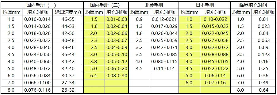圖 4 二.2.1 產品厚度分析 最大厚度是 11..28mm,最小厚度是 1.9mm,平均厚度是 4.12mm 查表相關填充特性(圖 4):使用北美手冊的填充 時間為 0.080-0.115 秒,速度參考 34-42 米/秒