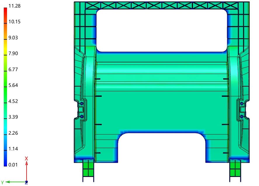 圖 11 關于結果的含義解析不再復述。通過觀察成型不良模擬結果組別(圖 11)發現后地板成型不良缺陷位置主 要集中在產品兩側輪罩(充型需要爬坡,充型困難位置)和最后成型位置(尾端)。