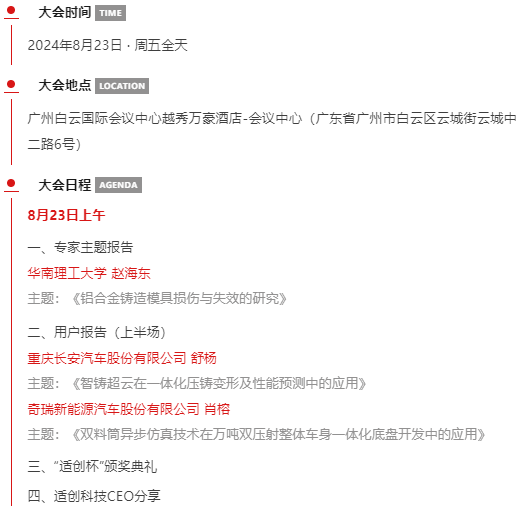 同期活動:適創(chuàng)用戶大會 作為大賽的主辦單位,也作為大賽指定模流分析軟件供應商,適創(chuàng)科技是自主仿真軟件的代表,也始終致力于為中國壓鑄和模具行業(yè)的發(fā)展貢獻力量,就在8月23日同一地點,適創(chuàng)科技將舉辦2024第二屆用戶大會,共同見證“適創(chuàng)杯”冠軍的誕生,同時我們將匯集行業(yè)的頂尖專家、企業(yè)代表和適創(chuàng)模流軟件的深度用戶,進行一次前瞻的、深刻的、創(chuàng)新的研討和交流,為推動壓鑄行業(yè)的高質(zhì)量發(fā)展注入強大動力,共同見證行業(yè)的創(chuàng)新發(fā)展和變革圖景!