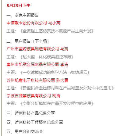 歡迎各界人士前來參會 適創(chuàng)科技的客戶及平臺注冊用戶; 對壓鑄前瞻技術(shù)感興趣的從業(yè)者; 對模流分析和軟件感興趣的從業(yè)者; 想與壓鑄行業(yè)專家深度交流的朋友; 關(guān)心適創(chuàng)科技未來發(fā)展的各界伙伴; ......