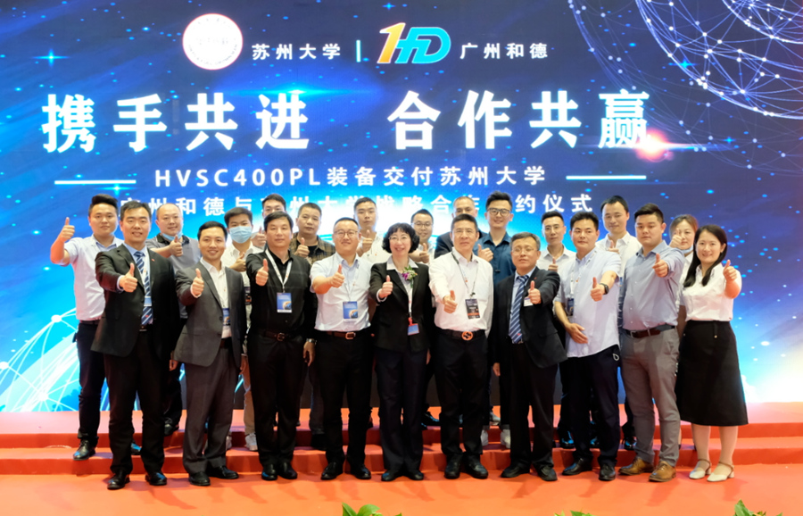 蘇州大學張海教授與廣州和德石洪偉總經理 隨后,廣州和德總經理石洪偉向雙方達成的戰略合作表示感謝。他表示,和德將第三代HVSC400PL型擠壓鑄造裝備交付給蘇州大學,雙方將在基于擠壓鑄造成型工藝專用材料研發,80-120MPa機械靜壓力下凝固過程中溫度、壓力對產品力學性能的影響等基礎理論方面進行研究,最終形成基于此工藝的底層數據及邏輯框架,廣泛服務于擠壓鑄造行業。 儀式最后,在與會領導和行業同仁的見證下,校企雙方領導共同簽訂了戰略合作協議,并合影留念。